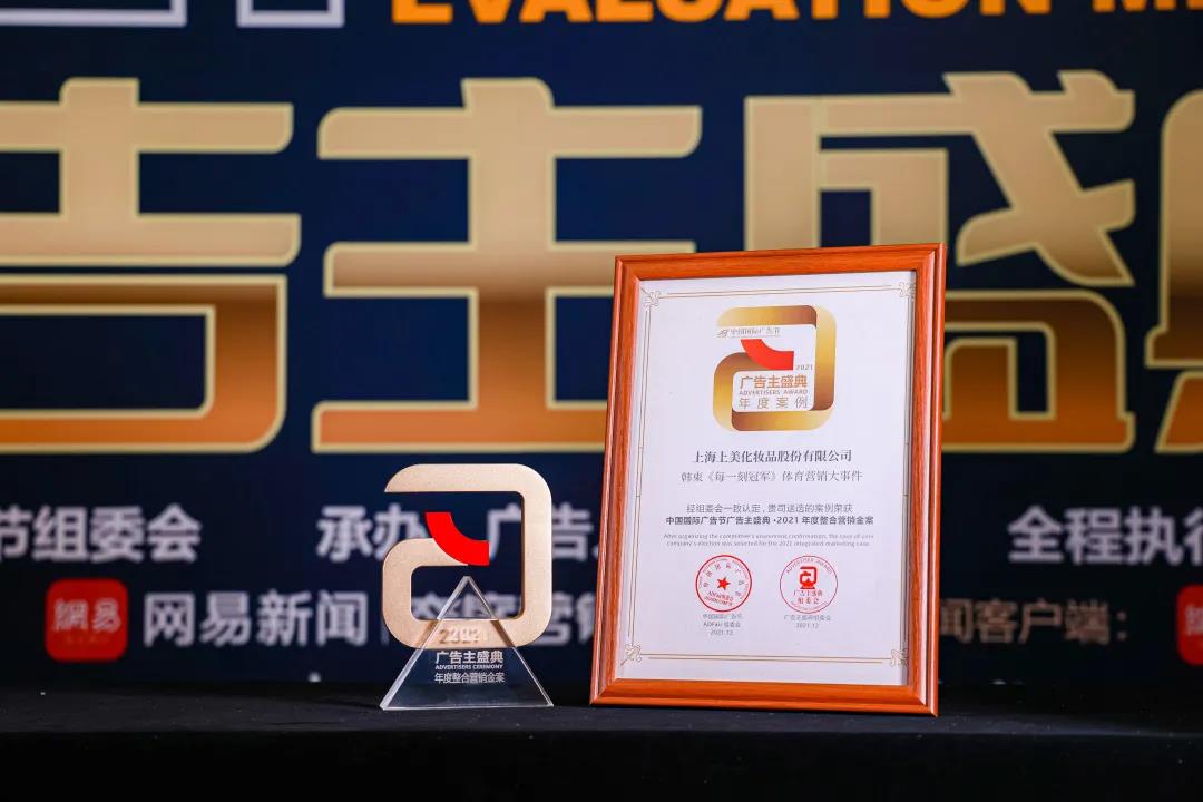 2021年12月12日,中國國際廣告節(jié)2021廣告主盛典在福建廈門舉行, 2021中國廣告主獎隆重揭曉,上美集團“韓束《每一刻冠軍》體育營銷大事件”從一眾優(yōu)秀案例中脫穎而出,摘得 “2021年度整合營銷金案”大獎。