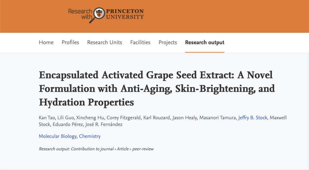 近日,上美集團(tuán)與普林斯頓大學(xué)分子生物學(xué)系教授Jeffry B. Stock博士共同發(fā)表 “包裹活性葡萄籽提取物(E-AGSE):一種具有抗衰老、提亮膚色和保濕作用的新配方”的論文,被普林斯頓大學(xué)研究中心學(xué)術(shù)引擎網(wǎng)站收錄,這意味著上美的領(lǐng)先成果獲得國際頂尖學(xué)術(shù)殿堂的認(rèn)可,也充分展現(xiàn)了上美強(qiáng)大的基礎(chǔ)研究實(shí)力。