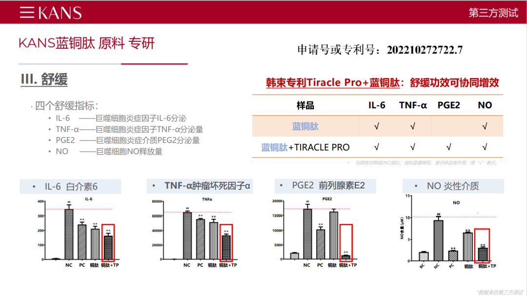全新抗老思路有了,韓束開始對眾多具有抗皺功效、尤其是作用于DEJ層的原料進行大規(guī)模篩選,最終選擇了“藍銅肽”這一溫和又有效的成分。為了放大其功效,韓束研發(fā)團隊開展了大量的復配實驗,結果顯示自主專研原料Tiracle Pro與藍銅肽的復配,能使巨噬細胞炎癥因子的4個舒緩指標顯著降低,協(xié)同舒緩效果顯著優(yōu)于單一藍銅肽。由此,韓束藍銅肽白金緊致系列得以成型。
