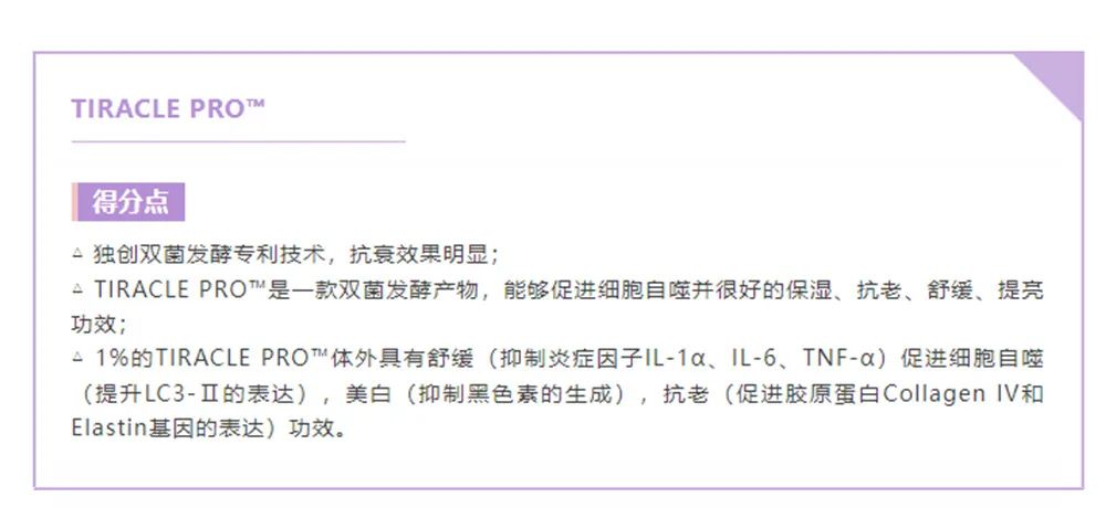 我們也持續(xù)做這個原料的開發(fā),我們用北海道長壽菌種納豆菌代替酵母菌,自噬和打通AQP3水通道蛋白,得到了二代升級的Tiracle Pro,這個原料擁有促進細胞自噬代謝作用,從而實現(xiàn)膠原蛋白提升、彈性蛋白提升、強韌DEJ層IV膠原、提亮膚色等功效,是一個非常 “能打”的選手。