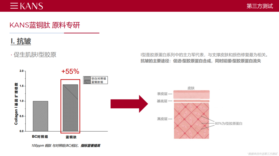 首先我們來看下藍銅肽促進I 型膠原蛋白的抗皺能力,眾所周知,抗皺的主要途徑之一就是促進I型膠原的產(chǎn)生,同時減少其流失。在這方面,0.01%添加量,在成纖維細胞,對比空白對照,提升了Ⅰ型膠原基因55%的表達量,同時,藍銅肽也能調(diào)節(jié)防止膠原降解相關的蛋白基因,最終對抗皺起正向作用。