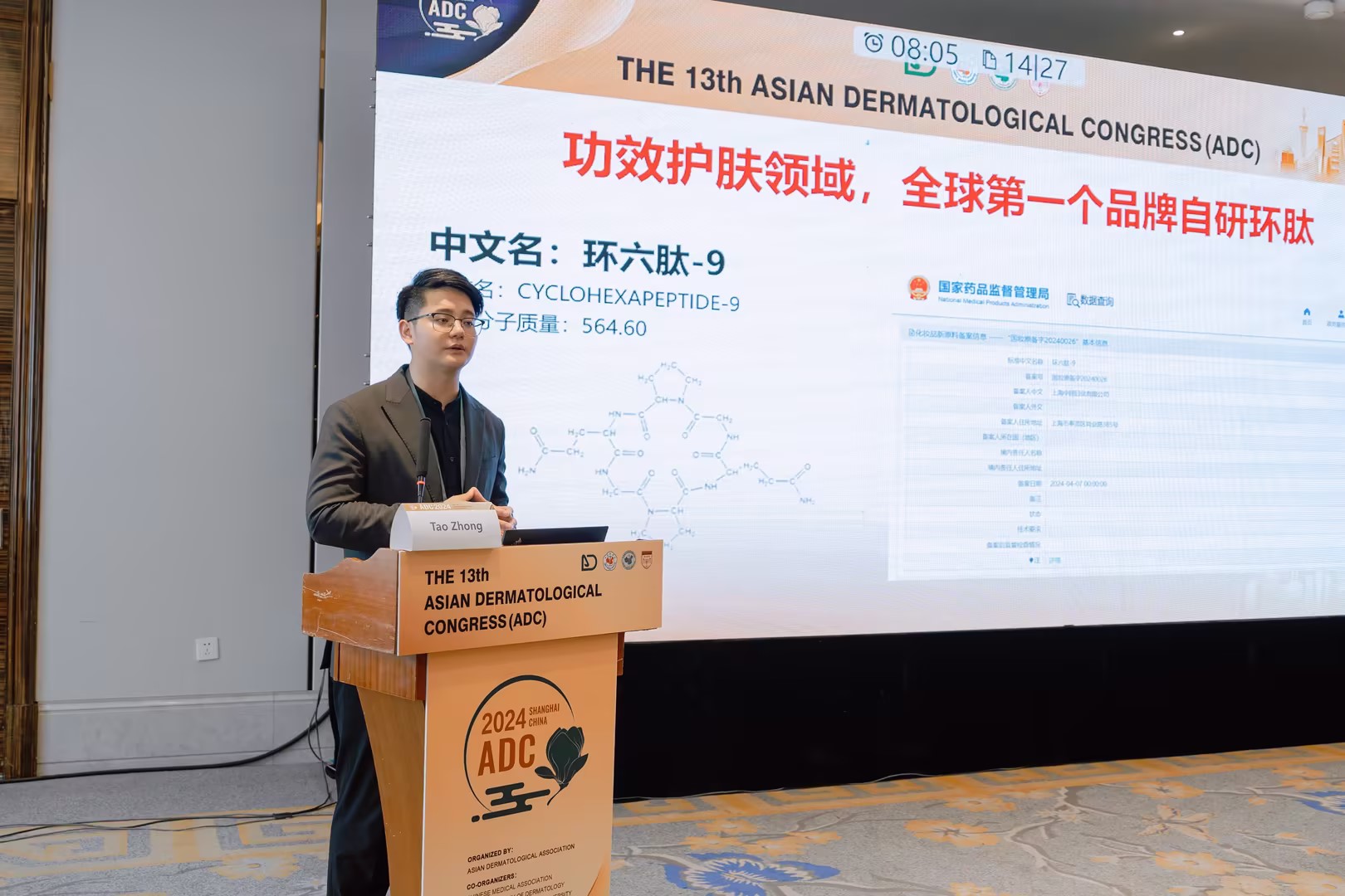 在會上,上美股份科學(xué)傳播總監(jiān)鐘濤進(jìn)行《一種新型環(huán)肽成分改善皮膚衰老的機(jī)理研究》主題演說,深度解析了皮膚的衰老機(jī)理,并發(fā)布顛覆性的抗衰新生科技“環(huán)六肽-9”的抗衰關(guān)鍵通路。