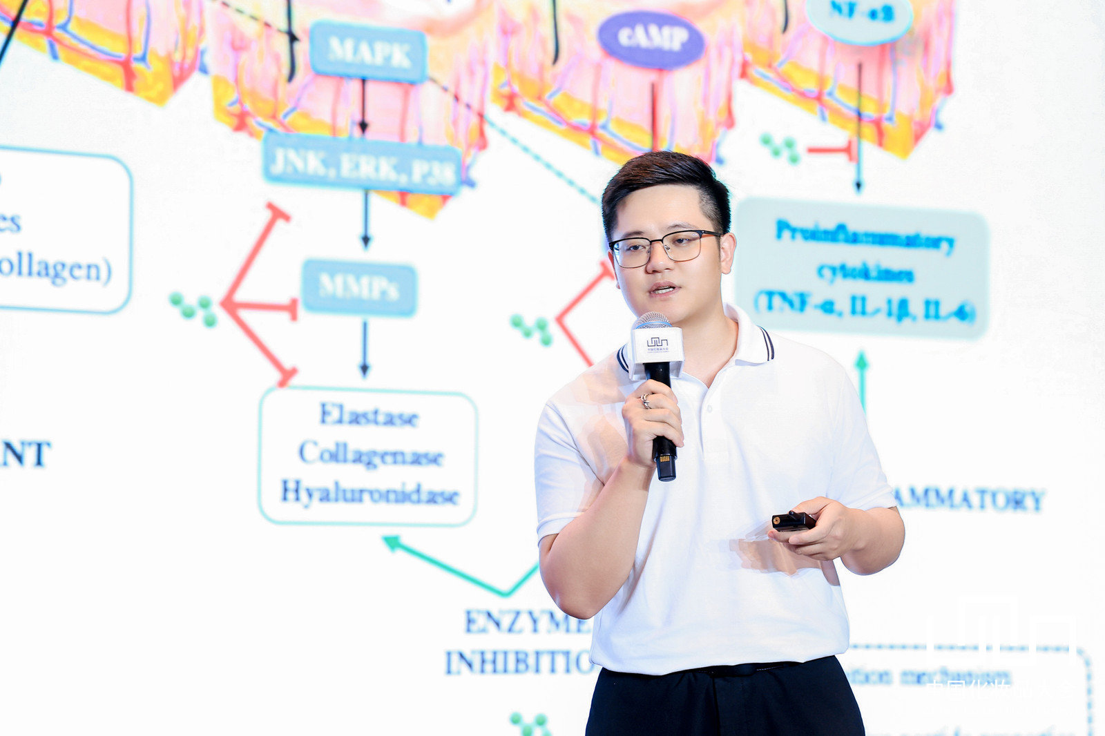 現(xiàn)場,上美股份科學(xué)傳播總監(jiān)鐘濤帶來了《探索肽類原料開發(fā)的創(chuàng)新與挑戰(zhàn)——多肽到環(huán)肽之路》的主題演講。