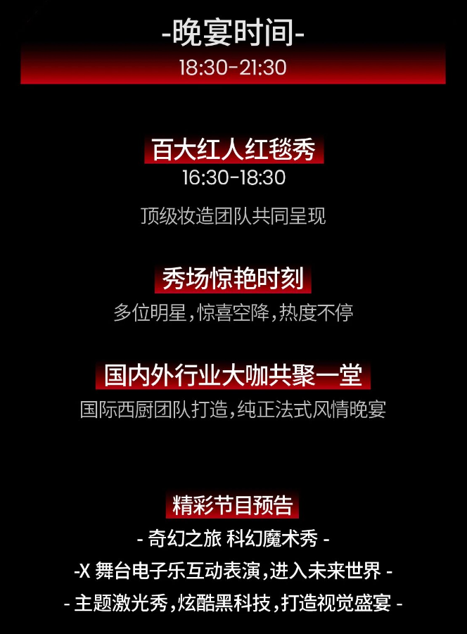 此外,晚宴還有更多精彩環(huán)節(jié)、演出,即將為您呈現(xiàn)兼具科技感、現(xiàn)代感、時尚感的視聽盛宴。