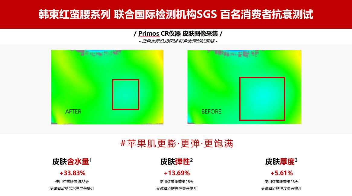 使用主打環(huán)六肽-9的抗衰老大單品紅蠻腰系列28天后,人體肌膚更彈、更嫩、更緊致,主要體現(xiàn)在以下兩大維度:
