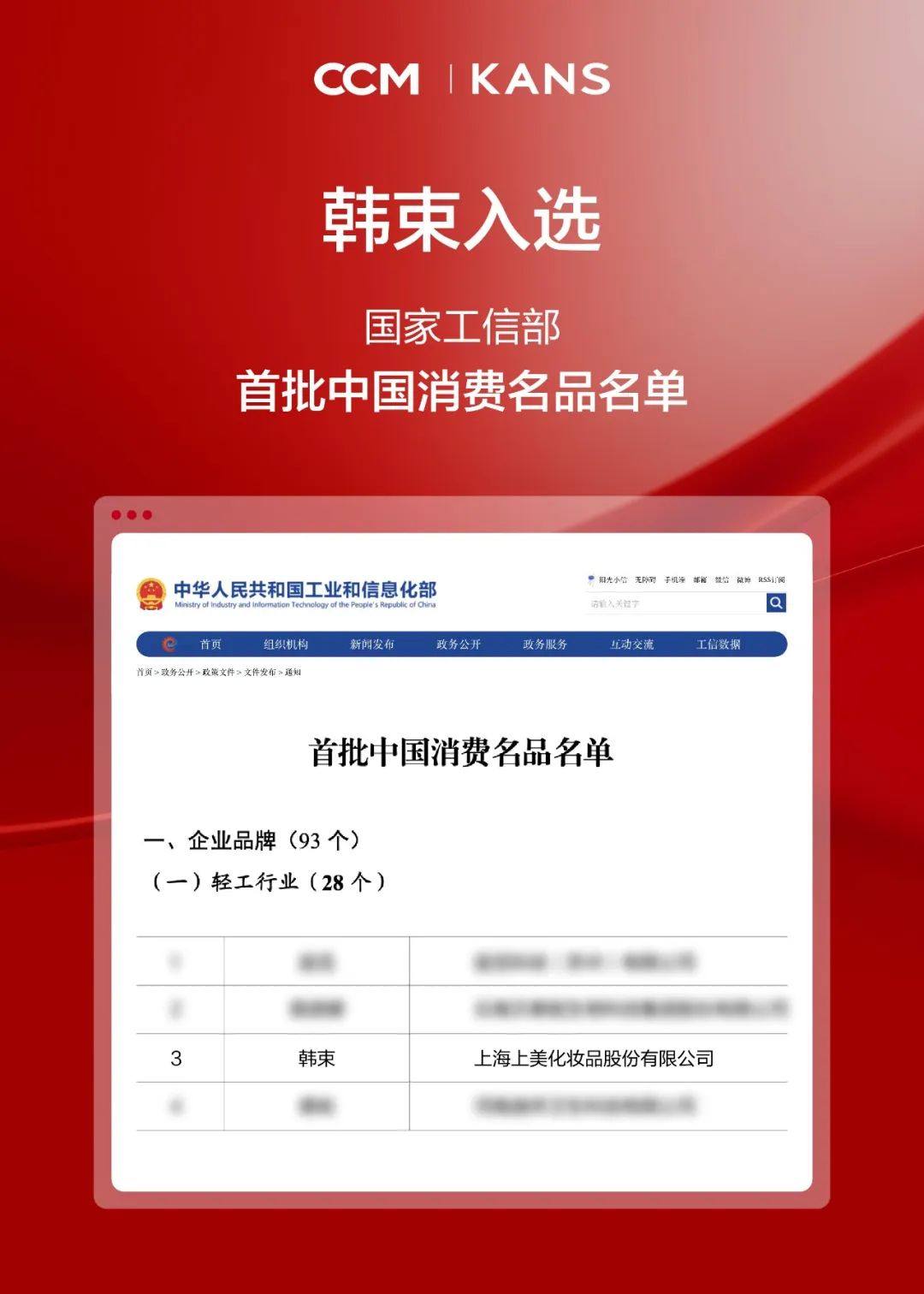 近日,國家工業(yè)和信息化部、新華社正式公示了首批《中國消費名品名單》,上美股份旗下品牌“韓束”光榮上榜,成為首批獲此國家級權(quán)威認(rèn)可的消費品牌之一。